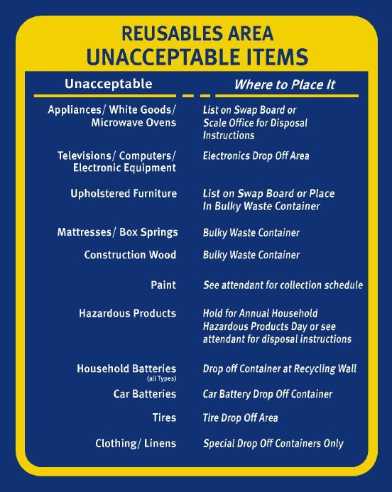 The Reusables Area (Take-it-or-Leave-It) is a swap area run by the Friends of Recycling Volunteers (FOR), a community based non-profit organization made up of Wellesley residents dedicated to helping the Town’s recycling program, and is open April through November. You can take and donate most household items that are in working order or easily repairable. In order to ensure that all residents have an opportunity to shop, please limit your visits to 30 minutes per day.